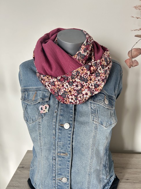 Snood double ou écharpe tubulaire mi-saison réversible composé d'un tissu en viscose et d'un tissu double gaze mauve.