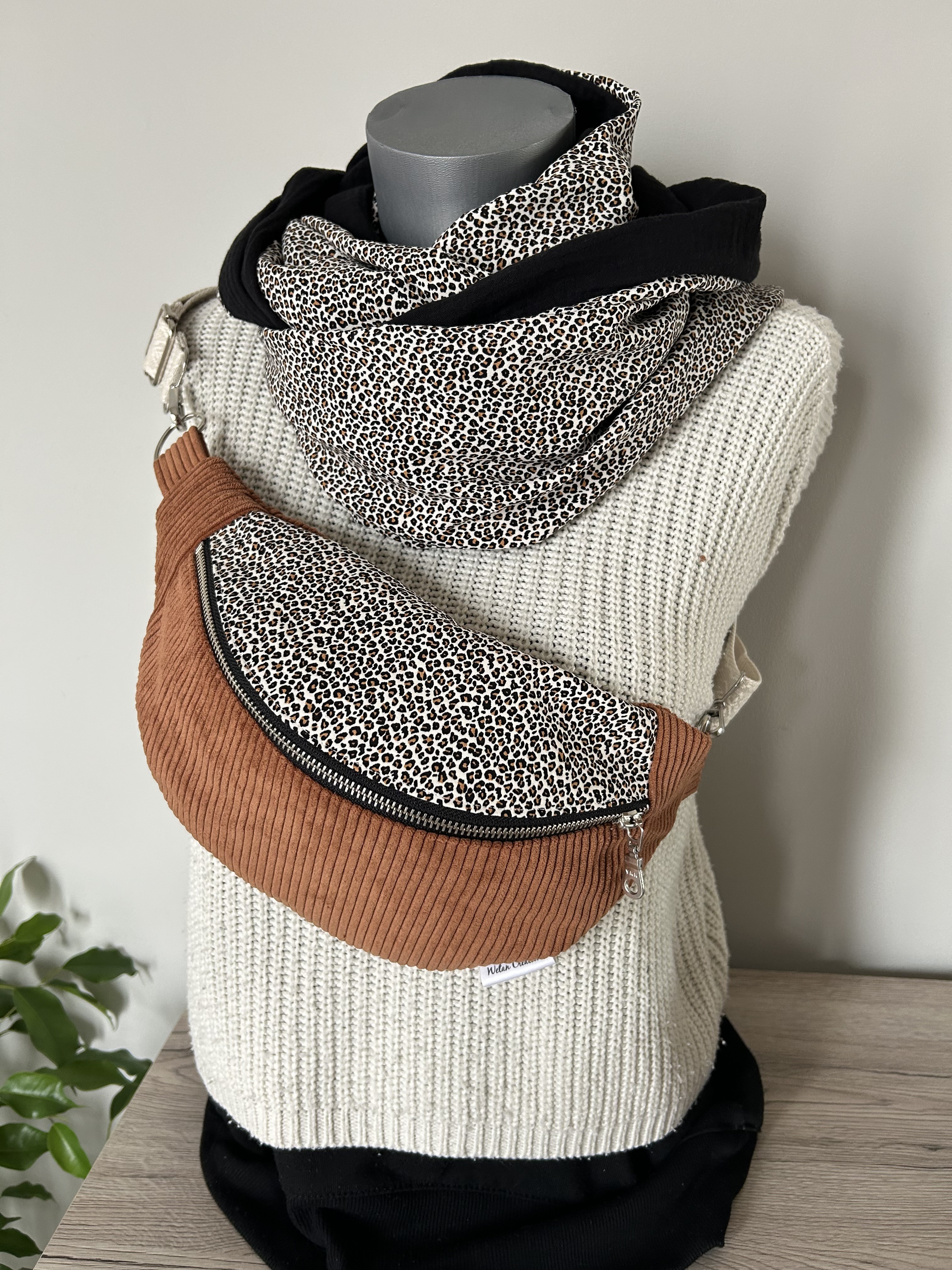 Tissu en velours côtelé marron et viscose à motif leopard doublé et intérieur avec ce même motif.