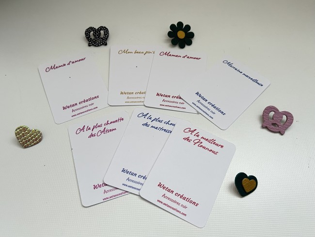 Des petits pins originaux, colorés, en cuir véritable, qui habilleront vos vestes, sacs, trousses, bonnets,...une idée cadeau original !