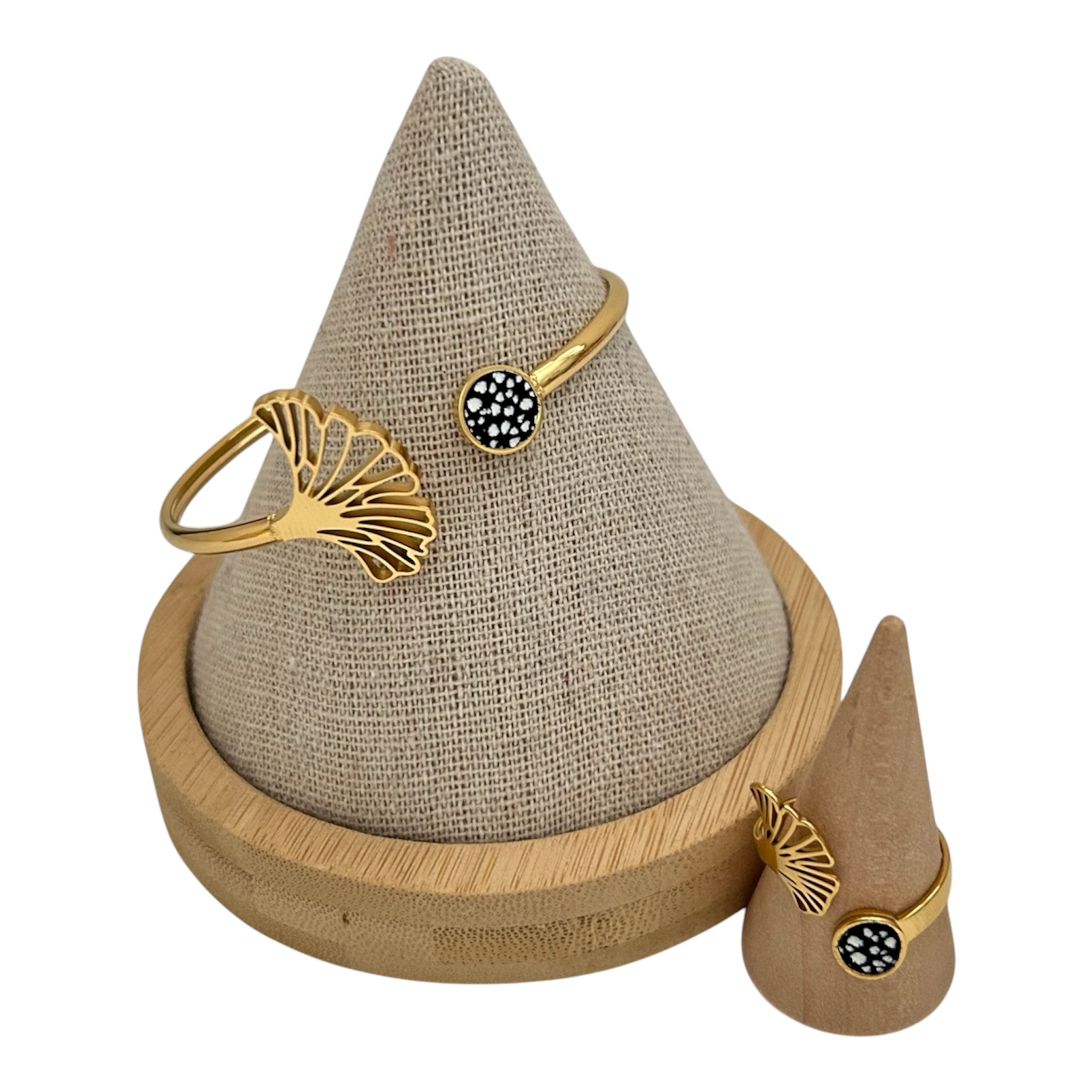 Parure feuille de gingko en cuir véritable de veau coloris noir et blanc composée de :
