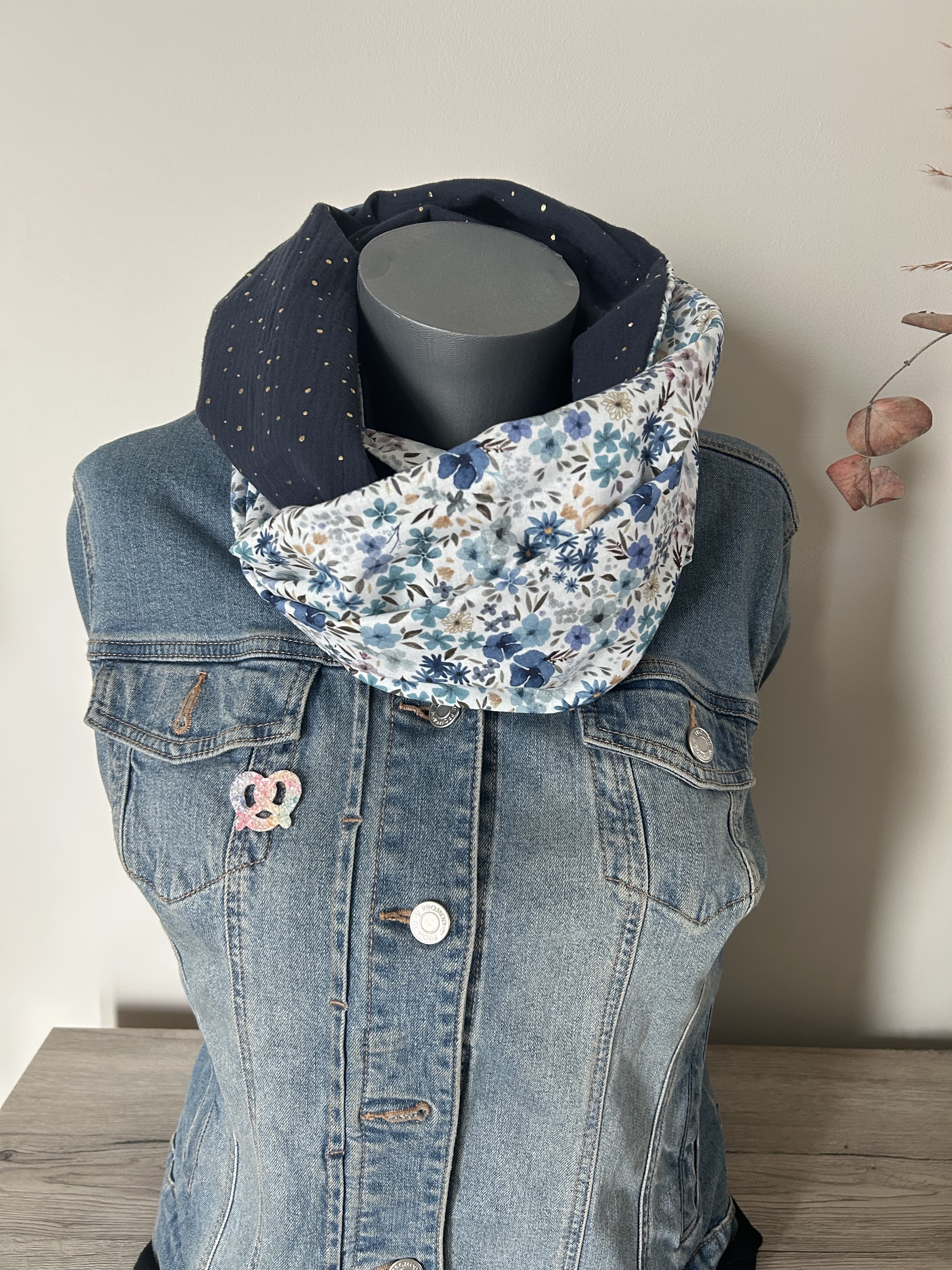 Snood double ou écharpe tubulaire mi-saison réversible composé d'un tissu en coton et d'un tissu double gaze marine pois doré.