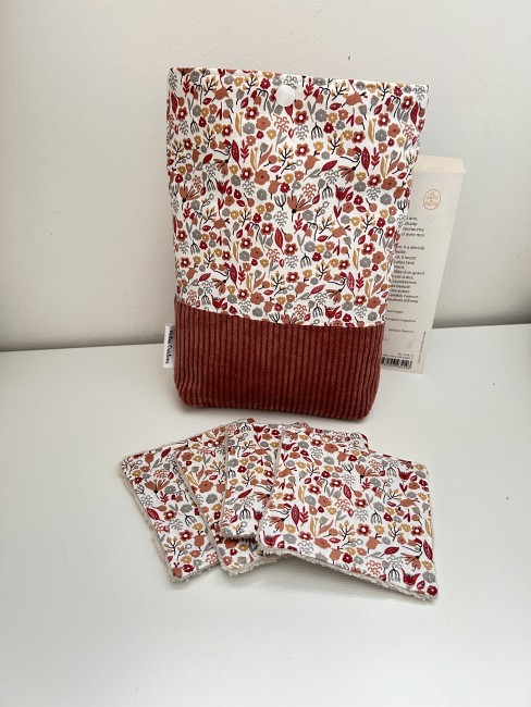 Trousse de maquillage en velours côtelé rouge bordeaux et doublé coton motifs petites fleurs