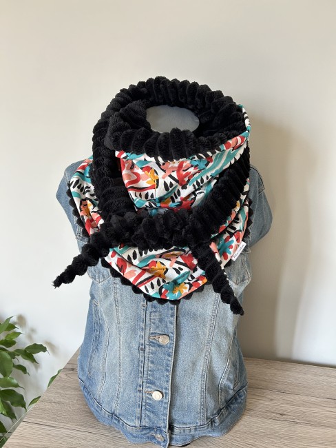 Chèche/écharpe triangle motif taches et minky côtelé noir