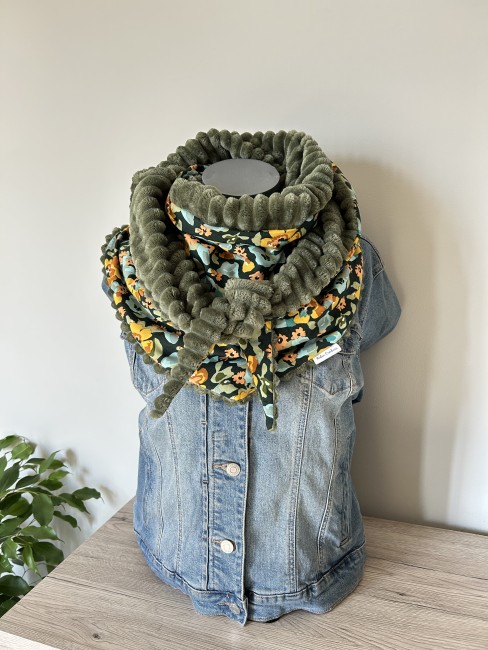 Chèche/écharpe triangle motif graphique anis et minky côtelé vert
